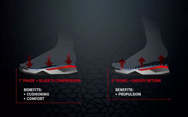 Ko pa se začne dvigati od tal, se vložki stisnejo in se ustvari učinek vzmeti, ki požene stopalo naprej.
