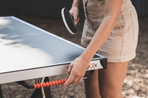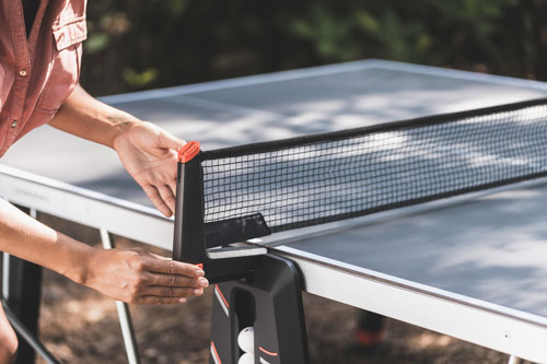 Bodite pozorni na model 500X. Ko postavite mizo, se mreža samodejno postavi v položaj. S koleščkom na dnu mreže izberite pravo višino za svojo igro. Nato napetost prilagodite tako, da preprosto povlečete vrvico in jo blokirate s sponko. Vaša mreža je popolnoma prilagojena in tako ste pripravljeni na igro.