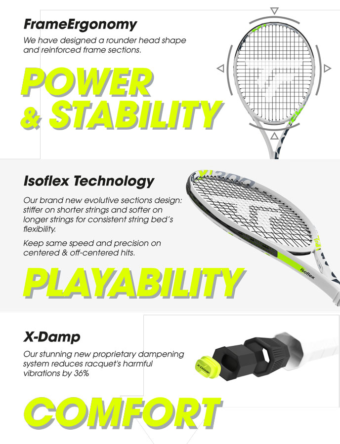 X-Damp: je nova tehnologija blaženja, ki so jo razvili že za loparje Lacoste. Tehnologijo je prvotno razvil Rene Lacoste, Tecnifibre pa jo je samo še izpopolnil. Na takšen način so zmanjšali vibracije za 36%, kar poveča udobje, zmanjša utrujenost in izboljša igralne lastnosti.